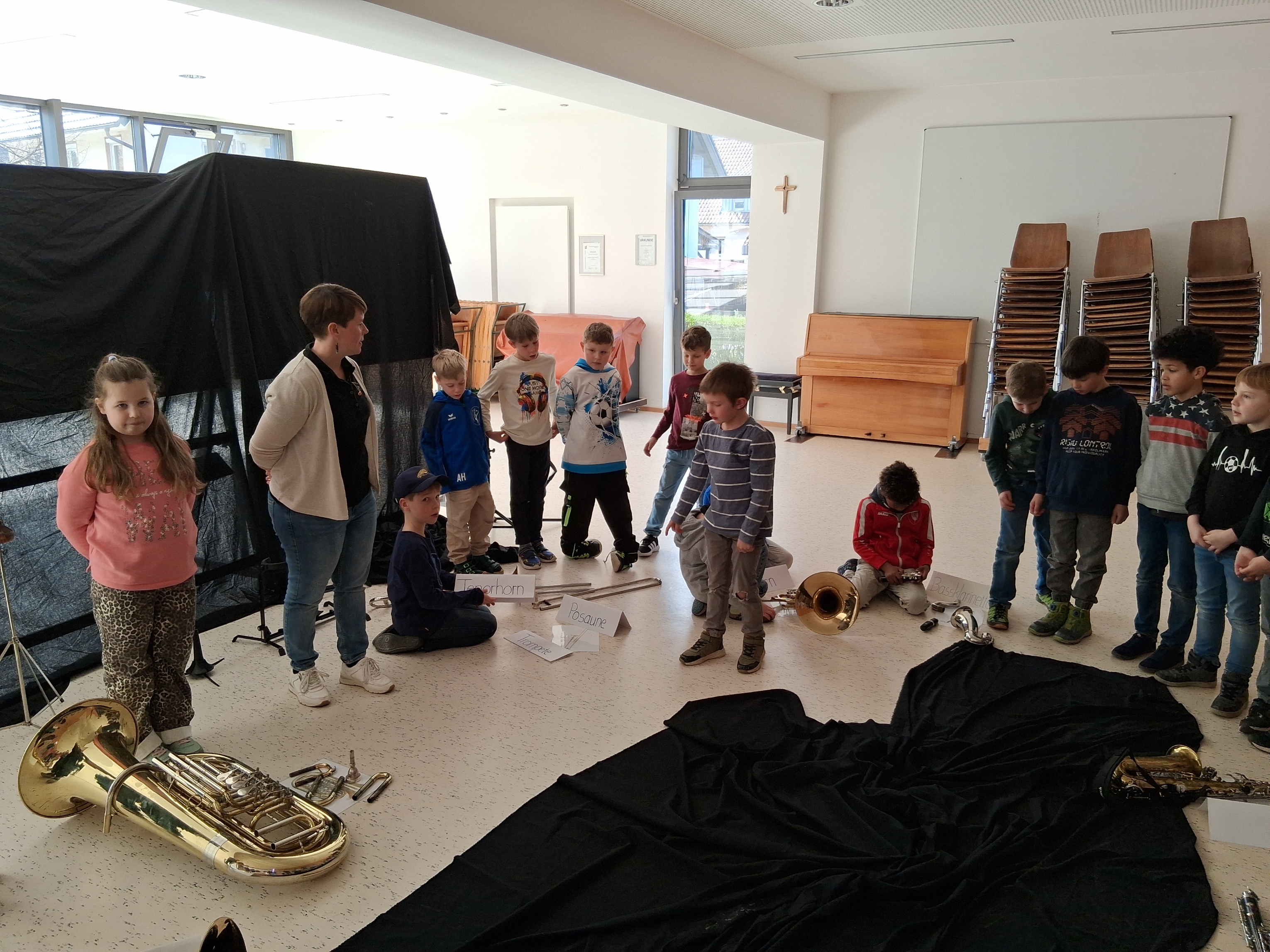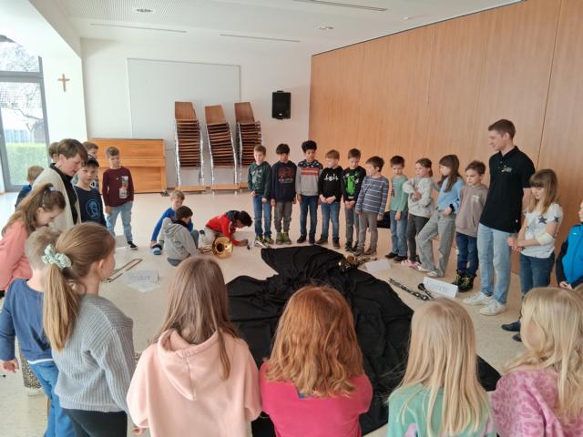 | Simone Obert und Fabio Halter vom Musikverein Steinach stellten den Erst- und Zweitklässlern in einer sehr gelungenen Kooperationsstunde verschiedene Musikinstrumente vor. |